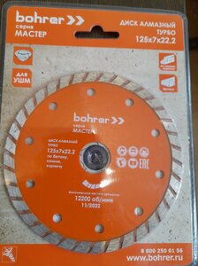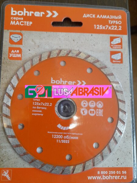 Диск алм. Bohrer Мастер 125х22,2 (сегмент 7 мм) (сплошн.), мокрый рез, по плитке